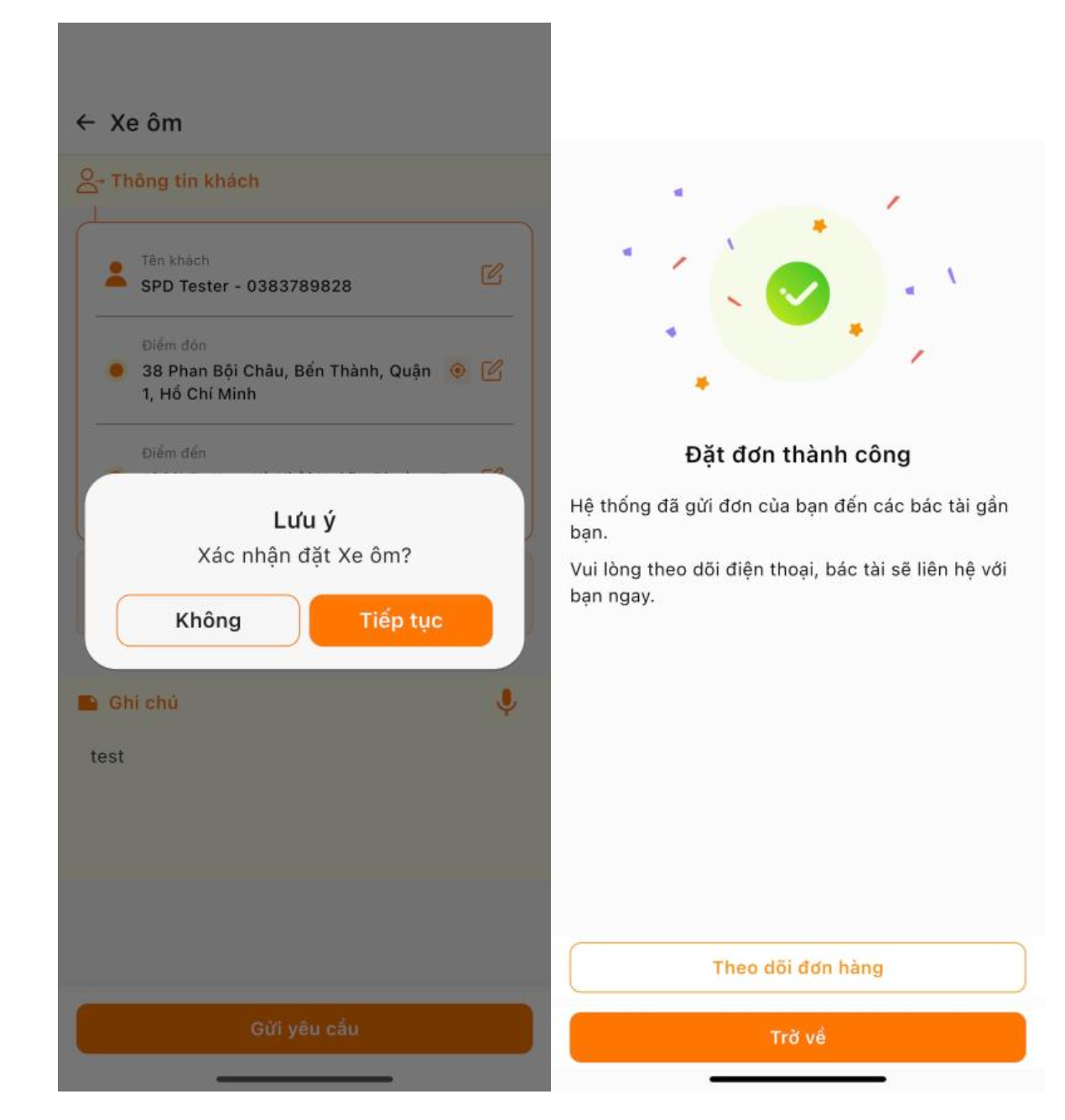 Bước 1: Người dùng ấn chọn “Gọi shipper” trên màn hình chính, nếu cần bố sung thông tin người dùng có thể điền vào phần ghi chú. Sau đó, người dùng ấn chọn lần lượt các nút “Đặt hàng”, “Tiếp tục”. Sau khi hoàn tất, hệ thống sẽ gửi đến cho người dùng thông báo thành công.