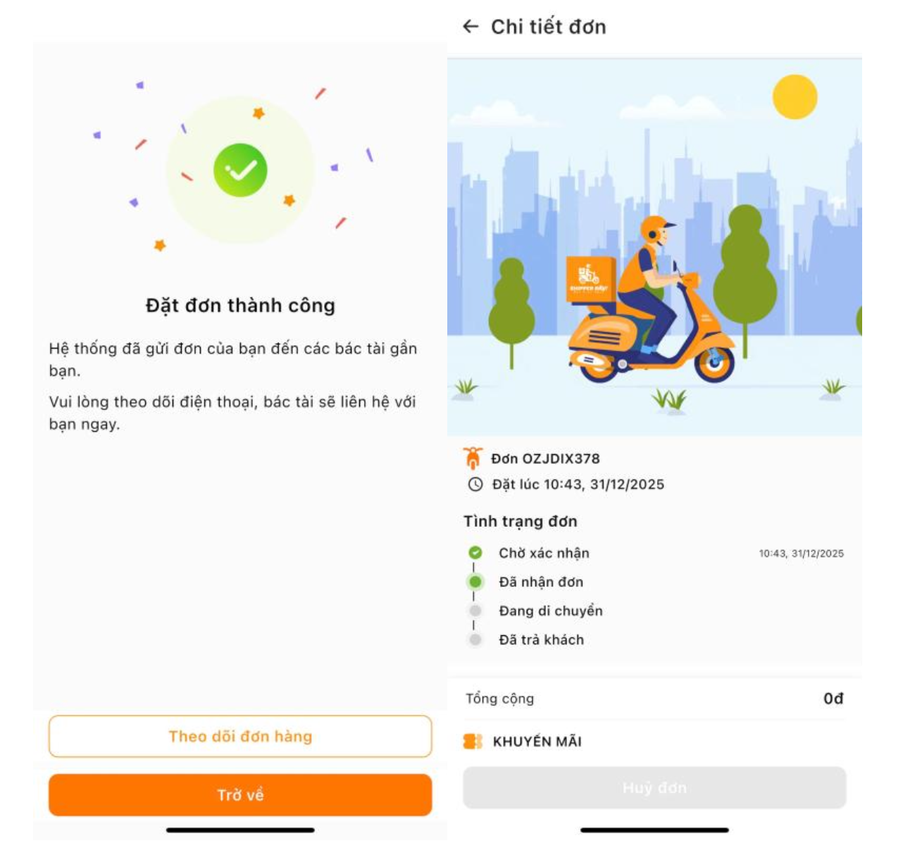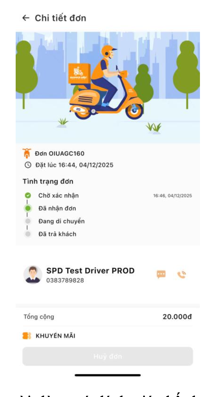 Sau đó, phía hệ thống sẽ quét phạm vi xung quanh người mua để tìm tài xế phù hợp nhận đơn hàng và tiến hành đến quan lấy đơn vận chuyển cho người mua. Người mua có thể gọi điện hoặc nhắn tin cho tài xế.