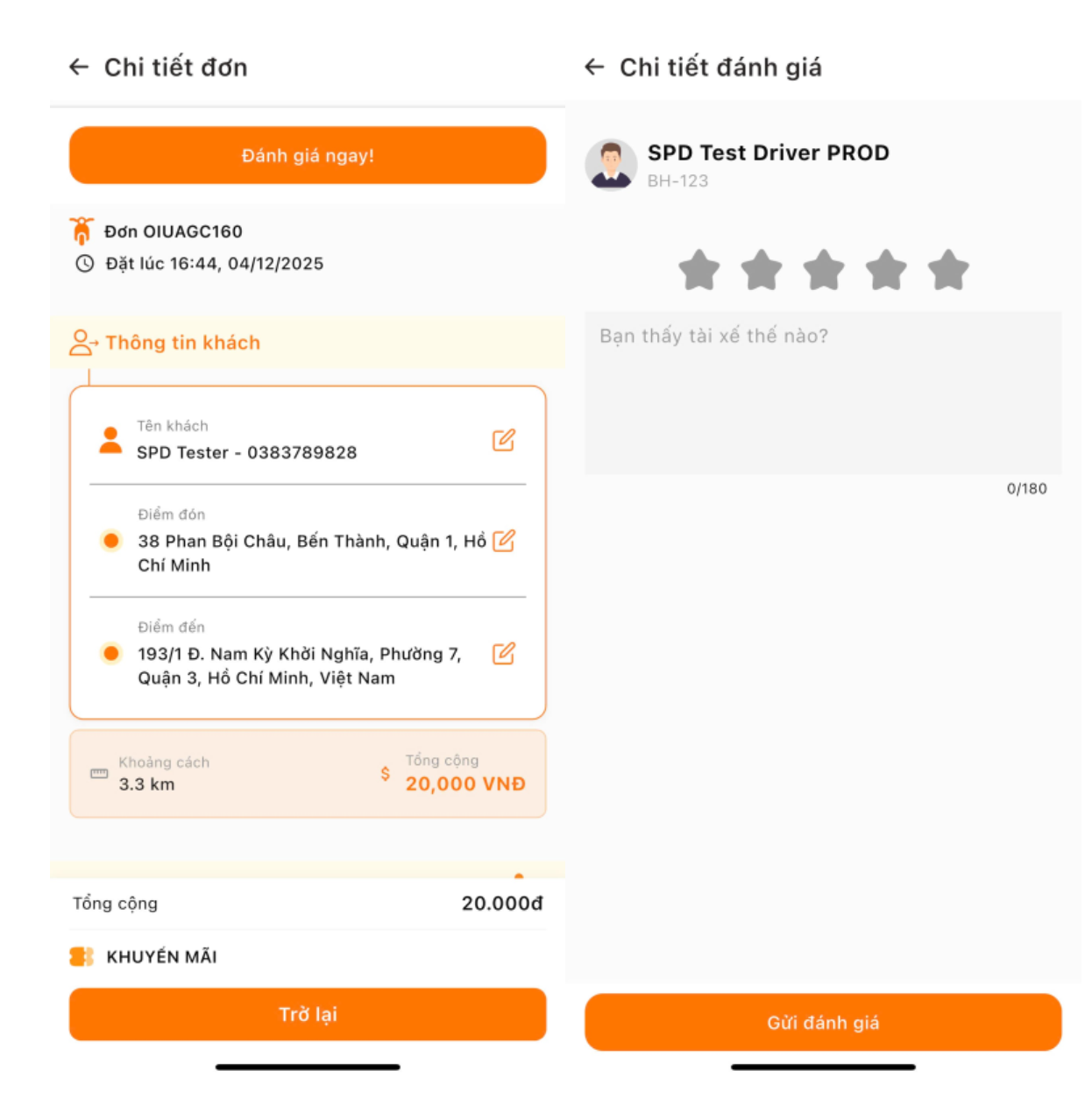 Khi đơn hàng hoàn thành, người dùng có đánh giá chất lượng chyến đi bằng cách nhẫn