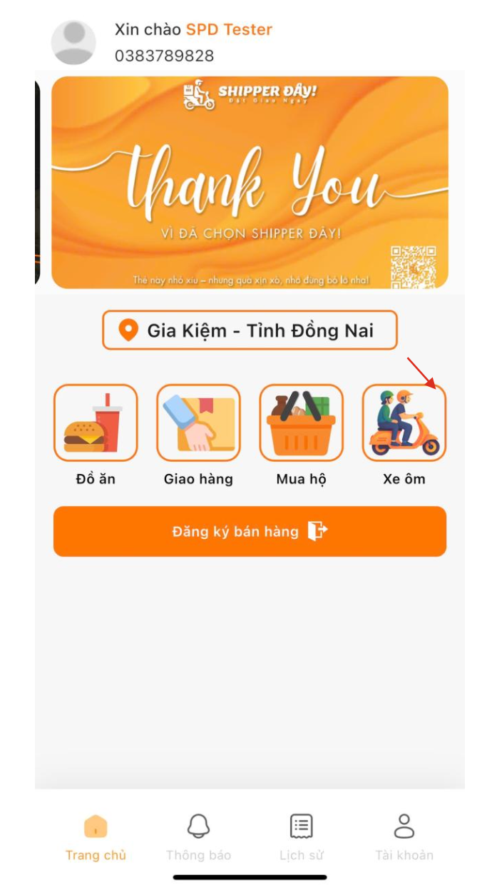 Bước 1: Người dùng nhấn chọn mục “Xe ôm” tại phần trang chủ.